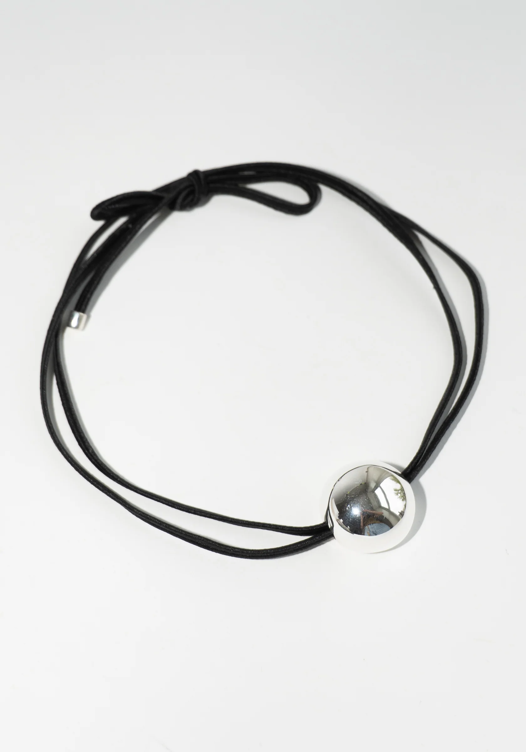 Silver Bowb Choker on Black Cord from Camille Surault. Round, smooth, light weight pendant. Features a tie closure.Â