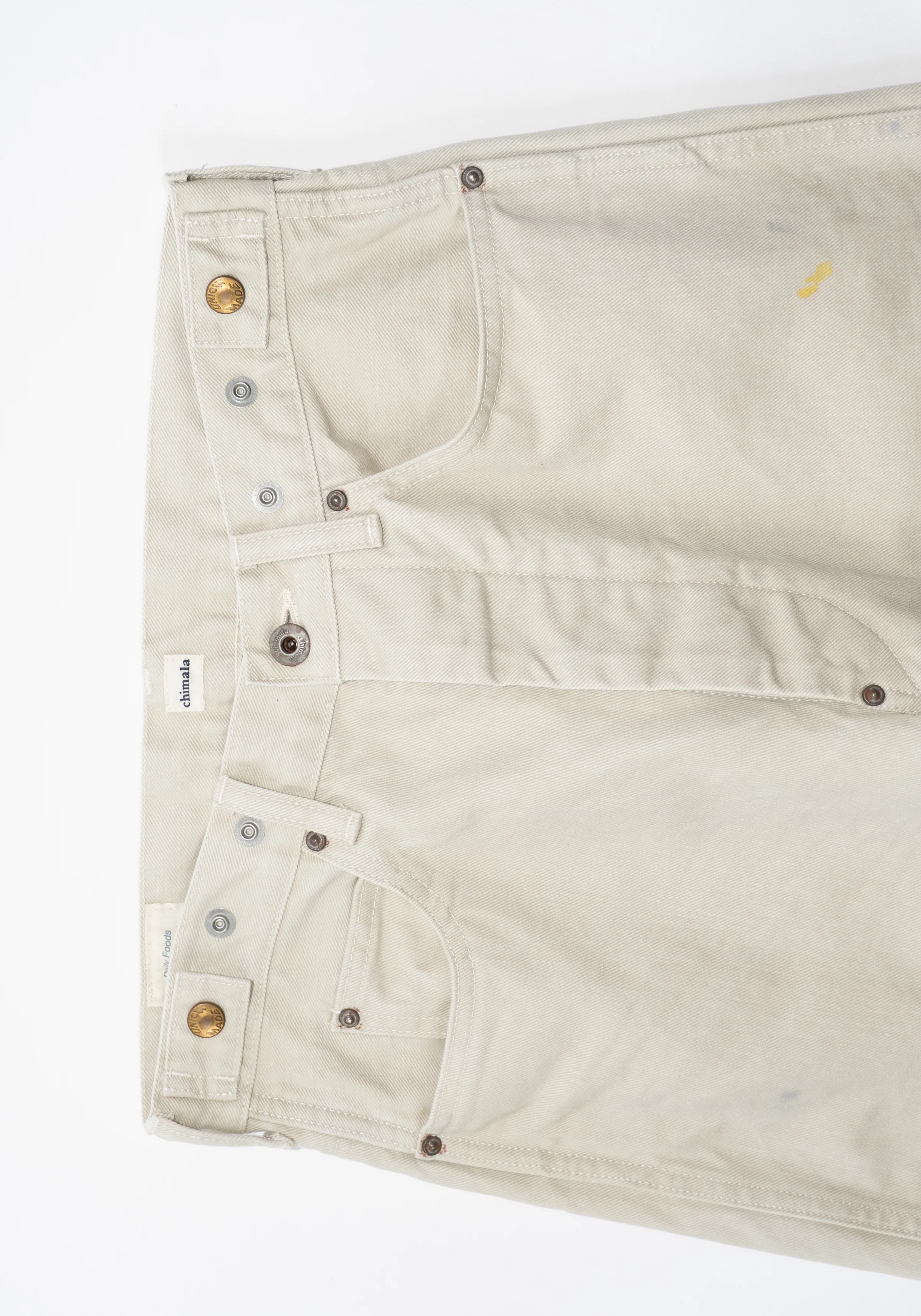 Unisex Adjustable Waist Denim Pants in Ivory from Chimala. Made from 100% cotton denim in a 12oz weight. Feature an adjustable waist with side button cinching detail, straight leg, distressing and paint splatter throughout, zipper and button closure, with a classic five-pocket construction and Chimala patch on the back. Unisex.Â