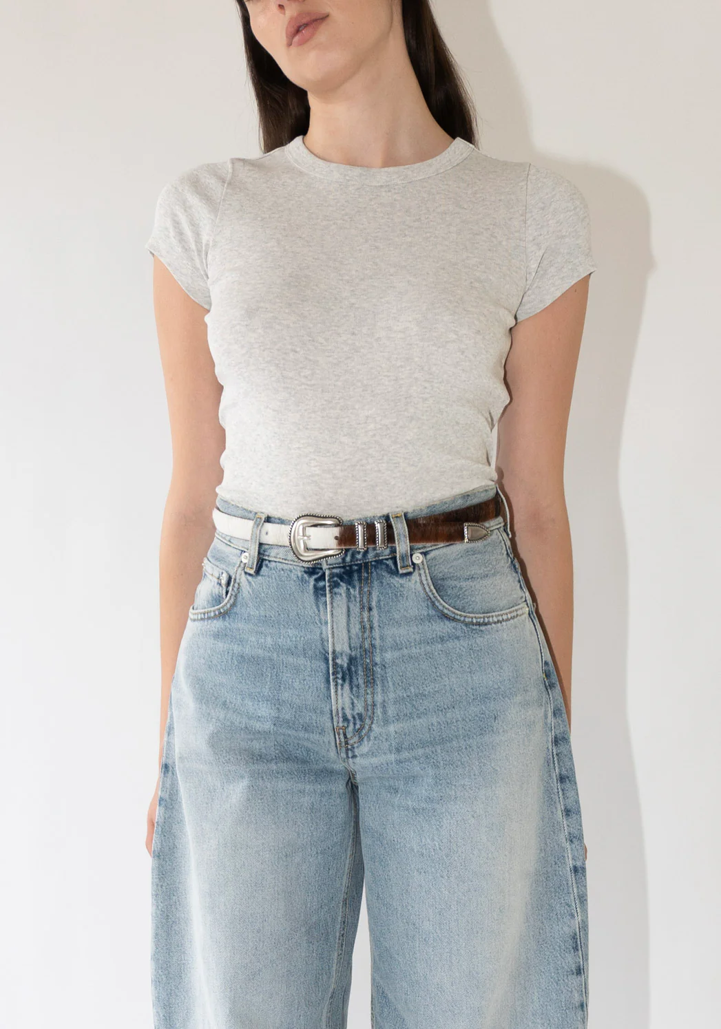 Car Baby Tee in Heather Grey from Flore Flore. A fitted tee with a lengthened short sleeve, round bindings, and a double-stiched cut-off seam on the back. Made from soft, medium-weight organic cotton rib, perfect for layering.