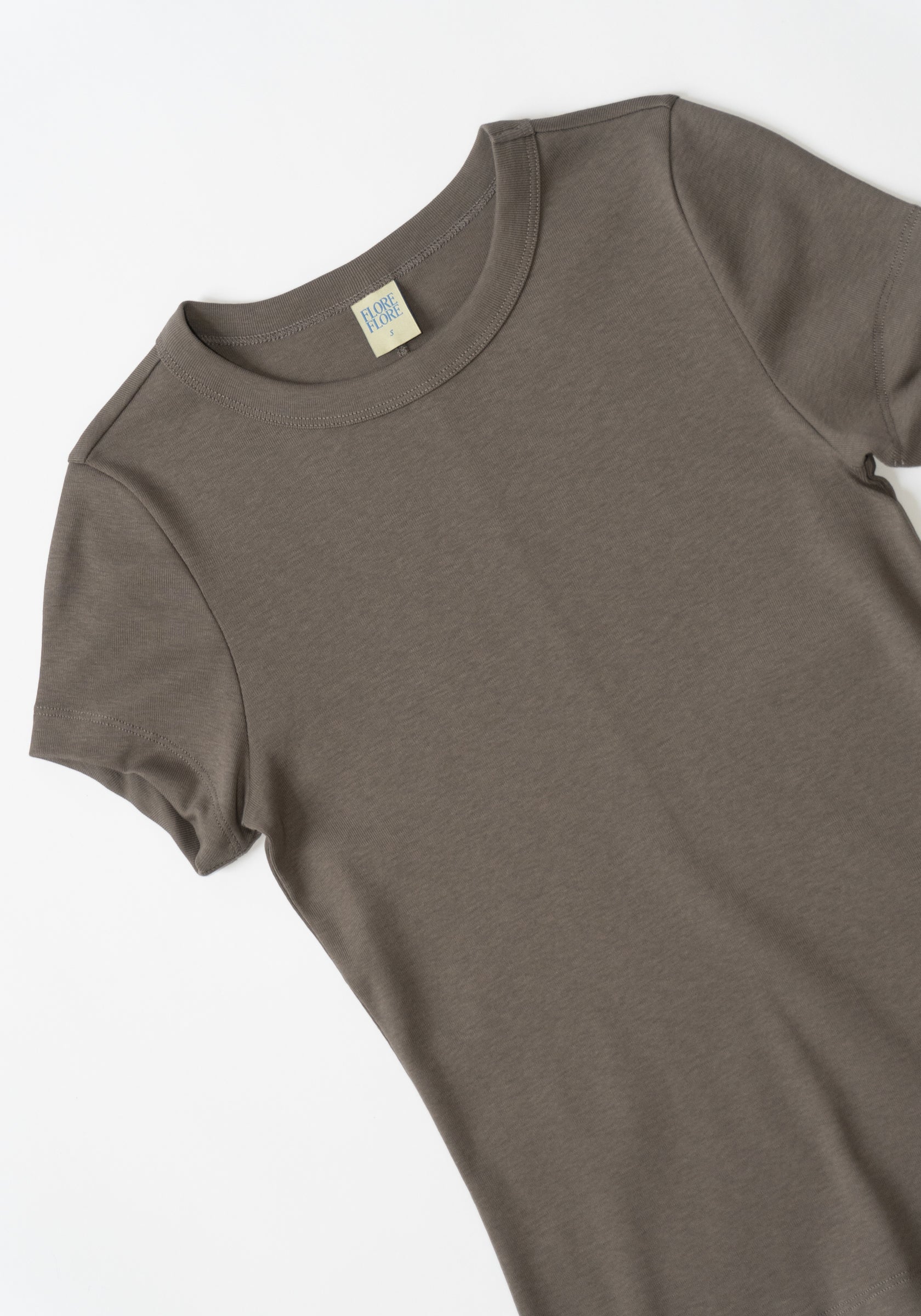 Car Baby Tee in Mushroom from Flore Flore. A classic short-sleeved baby tee with a round binding and a cut-off seam along the back, made from medium-weight organic cotton rib.