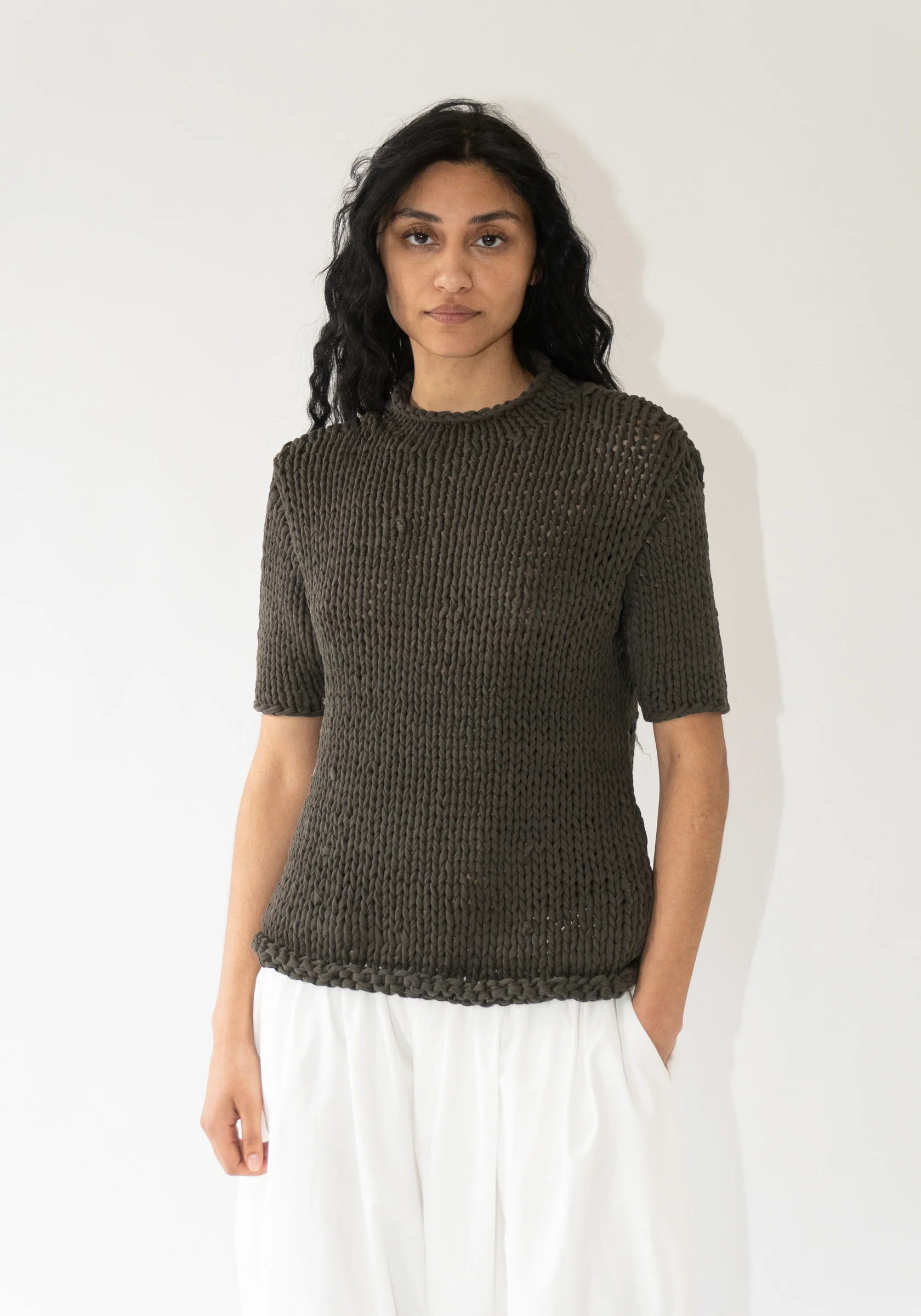 Handknit Jersey Tee in Washed Black from Lauren Manoogian. Chunky roll hem, handmade short sleeve sweater with open weave and textural feel. Made from 100% Pima Cotton.