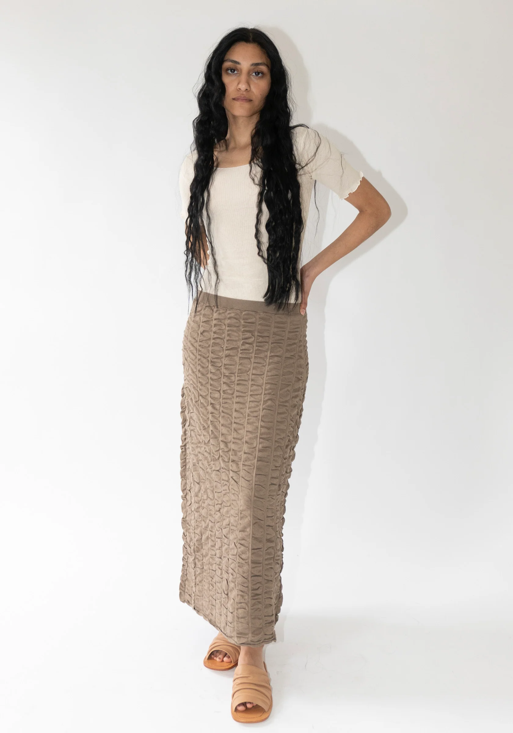 Ruche Skirt in Earth from Lauren Manoogian. Lightweight textural cotton skirt pull on skirt in maxi length. Made from 100% cotton. features elastic waist. Â