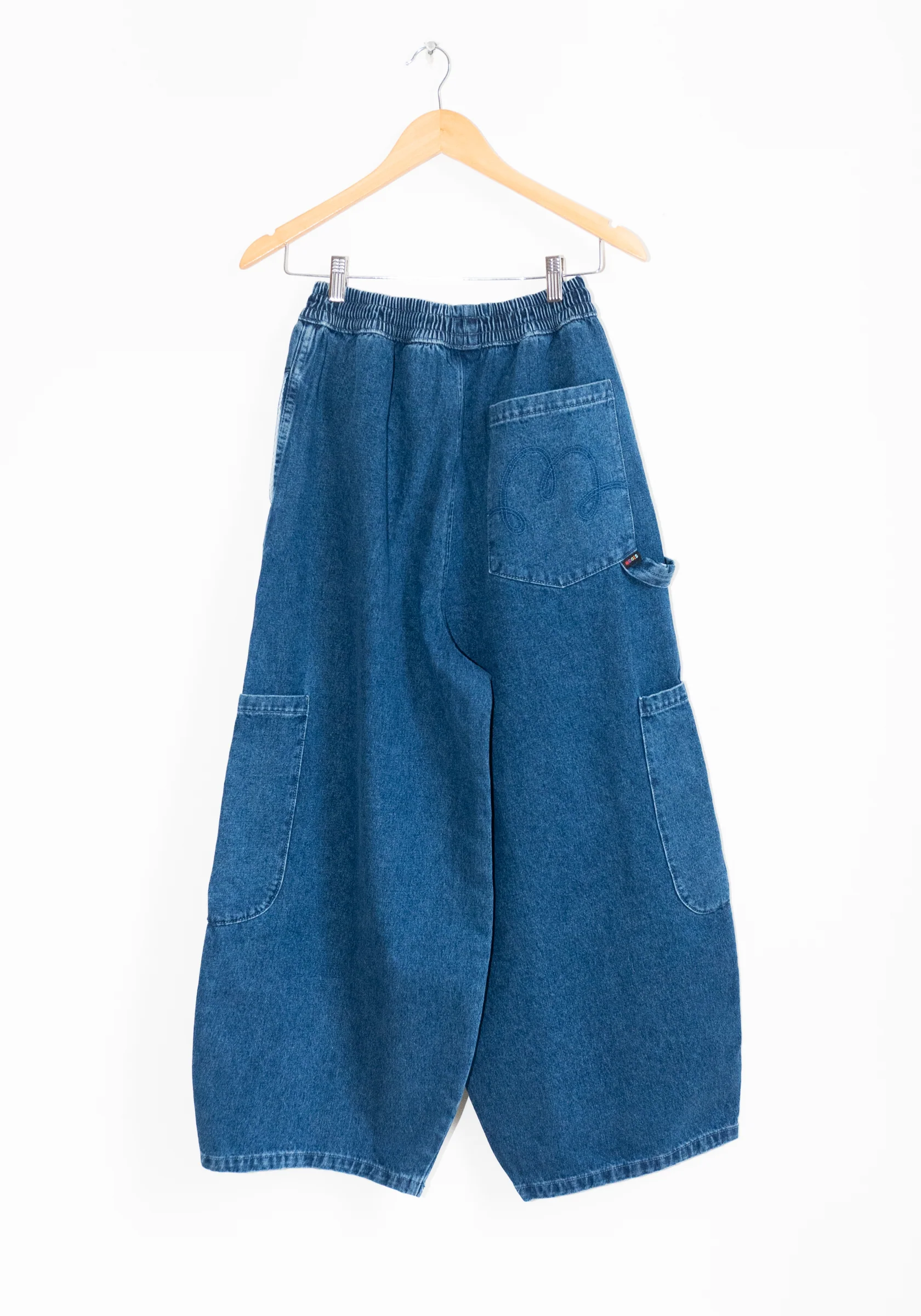Denim Chef Pants in Ranch Denim from Meals. Cropped pant has 5 big pockets, an elastic waist and drawstring. Made in soft-washed 100% cotton 10oz denim in Los Angeles. Additional features include on-seam pockets, big patch pockets at the side and back pocket, a tong loop, mock fly, and signature Meals pocket logo and tag.Â