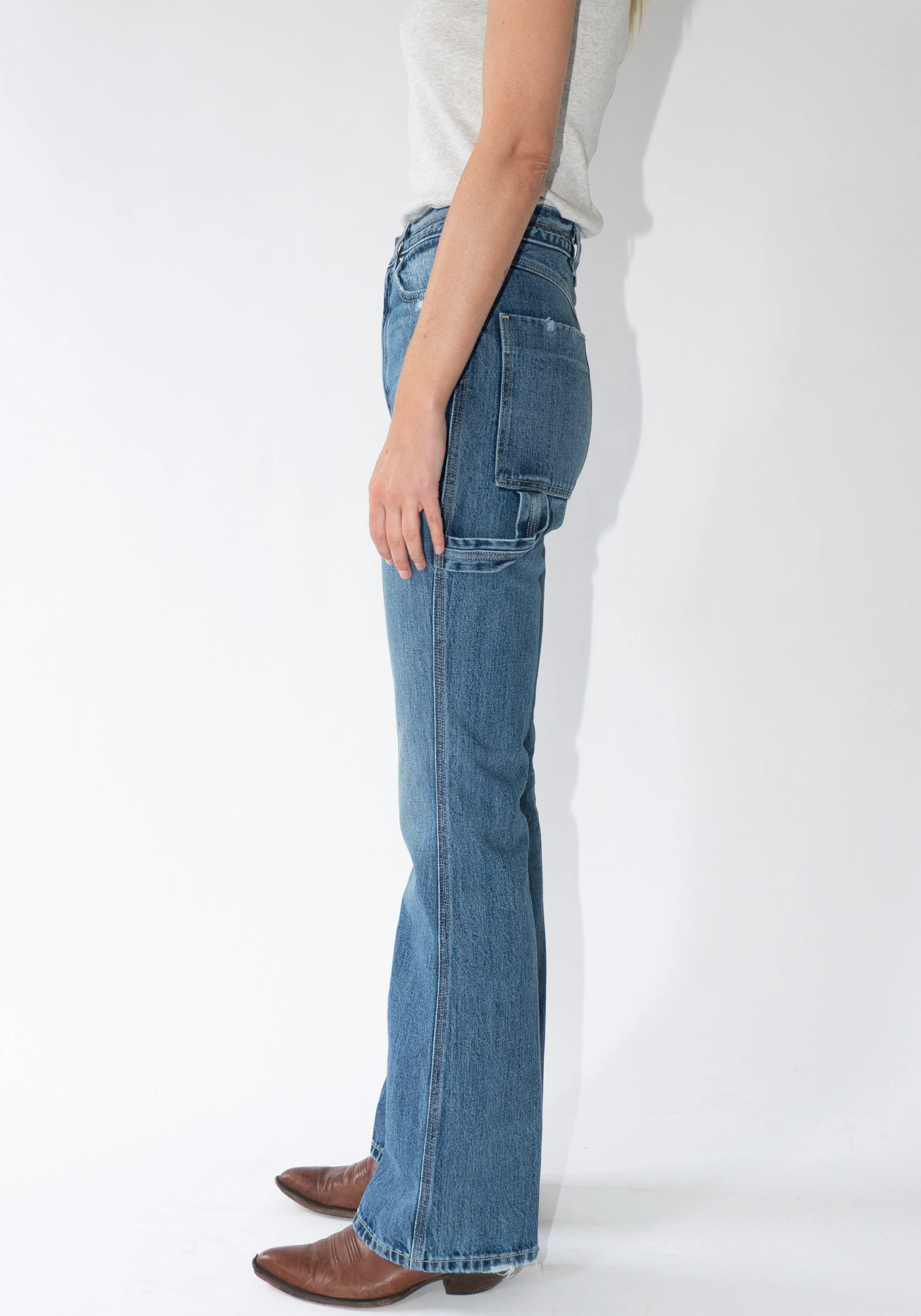 Clyde Jean in Haig Wash from RÙADH. Cut from non-stretch denim, the Clyde jeans have a high-rise waist and legs that flare out from the knee. Features a zip fly fastening and back pocket loop.