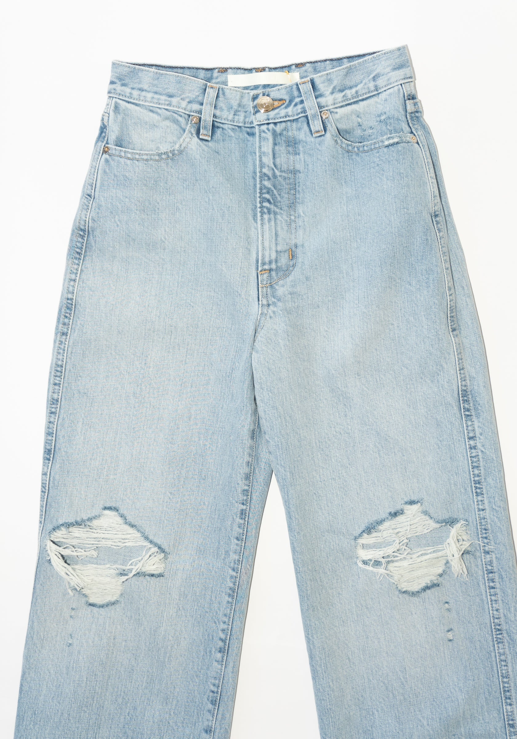 Ripped Quinn Jean in Brodie Wash from RÙADH. The Quinn is a high-rise, straight-leg jean crafted in heavyweight rigid Japanese denim. Features classic 5-pocket detailing with RÙADH signature triple belt loops at back waist and semi-precious gold hardware, zip fly and shank closure. This denim gets softer and more comfortable with age and wear. If you're in-between sizes, we recommend sizing up. Slim-fit through the waist and hips. This feels like our new going out jean.