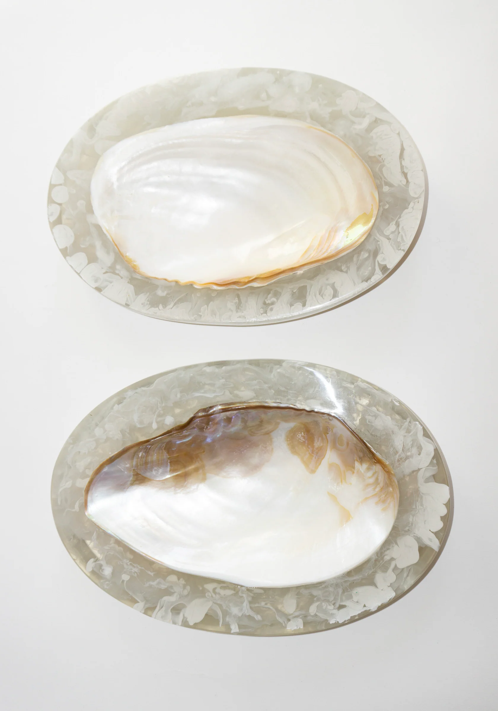 Large Resin Shell Caviar Dish in Clear is the perfect piece for entertaining or it makes a great centerpiece in any room. Each dish is handmade and one of a kind. Made from beautiful Cebu Clam shells.